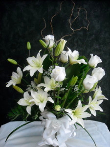 Loading... Please wait...White Lilys and Roses in clear vase.