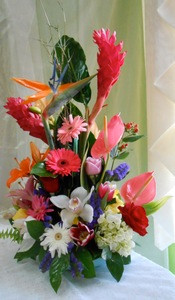 Assted Tropical ArrangementThis Tropical Arrangement has, Red Ginger, Gerbera Lilies, Anthurium, Bird of Paradise, Dendrobium Orchids, Roses. Call Emma's!